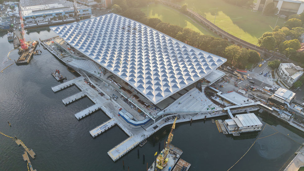 The new Sydney Fish Market at Blackwattle Bay features 6,000 square metres of public space across a four-storey market hall with restaurants, retail, offices, a ferry wharf, and a distinctive wave-shaped roof, while incorporating technology upgrades and a publicly visible auction area.
