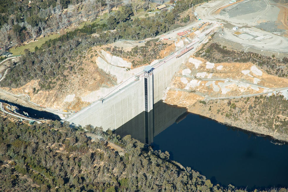 The enlarged Cotter Dam project in the ACT involved constructing a new 80-metre high roller compacted concrete dam 100m downstream of the 1912 original, increasing water storage capacity from 4 to 78 gigalitres to serve Canberra through the Stromlo Water treatment plant, while pioneering the world-first use of a concrete paving machine for RCC placement.